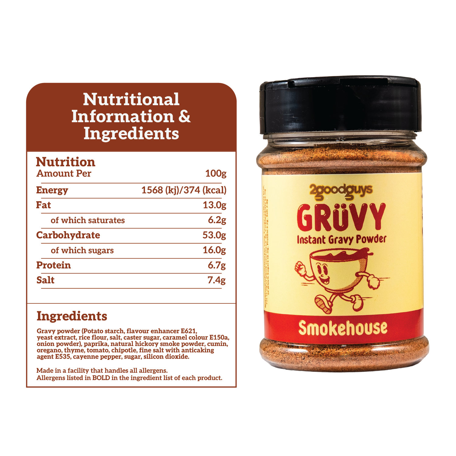 Gravy powder (Potato starch, flavour enhancer E621, yeast extract, rice flour, salt, caster sugar, caramel colour E150a, onion powder), paprika, natural hickory smoke powder, cumin, oregano, thyme, tomato, chipotle, fine salt with anticaking agent E535, cayenne pepper, sugar, silicon dioxide.