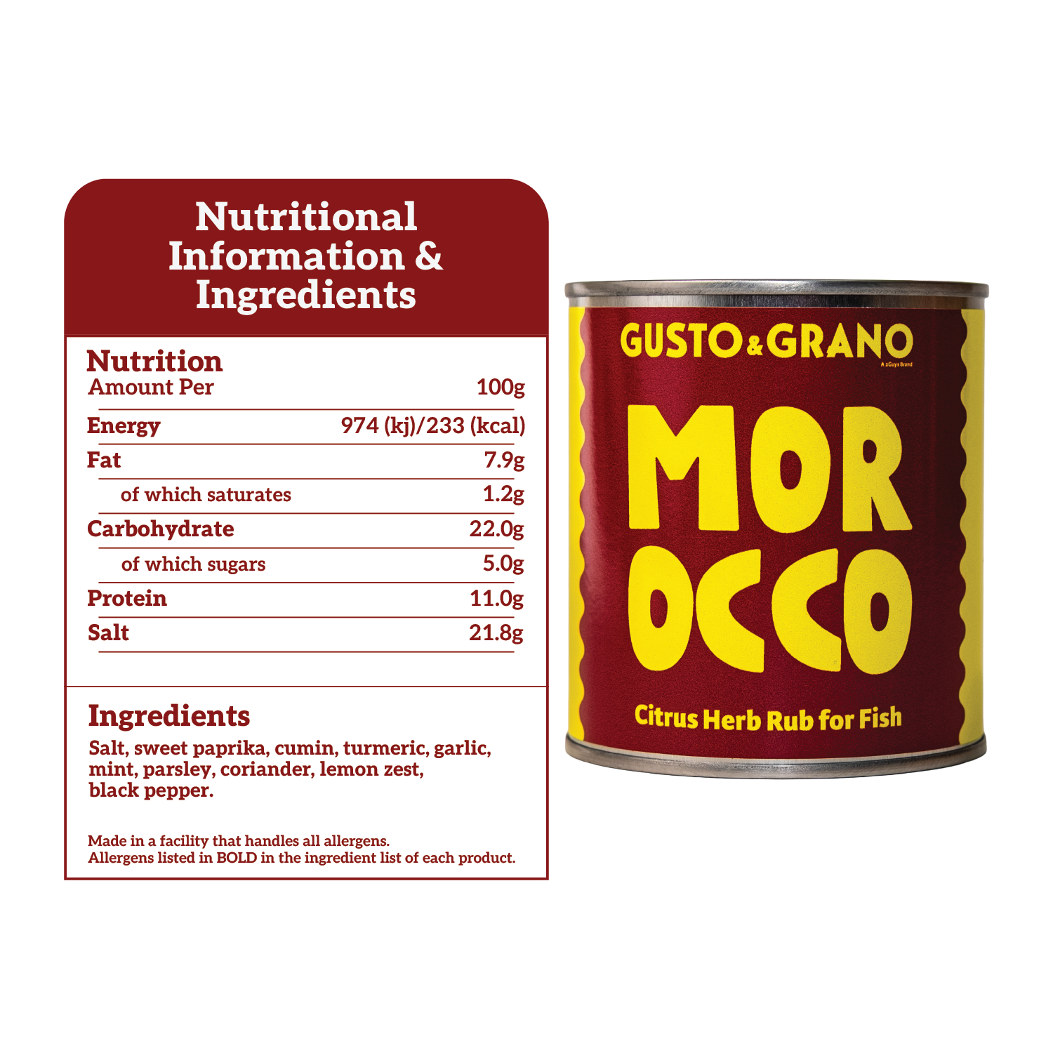 We totally love the flavours of Moroccan cooking and in this blend we've brought together its taste-stars including cumin, black pepper, turmeric, mint and coriander leaf and seeds. It's a blend that's well known as Chermoula and it's amazing with whole mackerel and sardines but also strong-flavoured white fish like hake, tuna and haddock or cod.