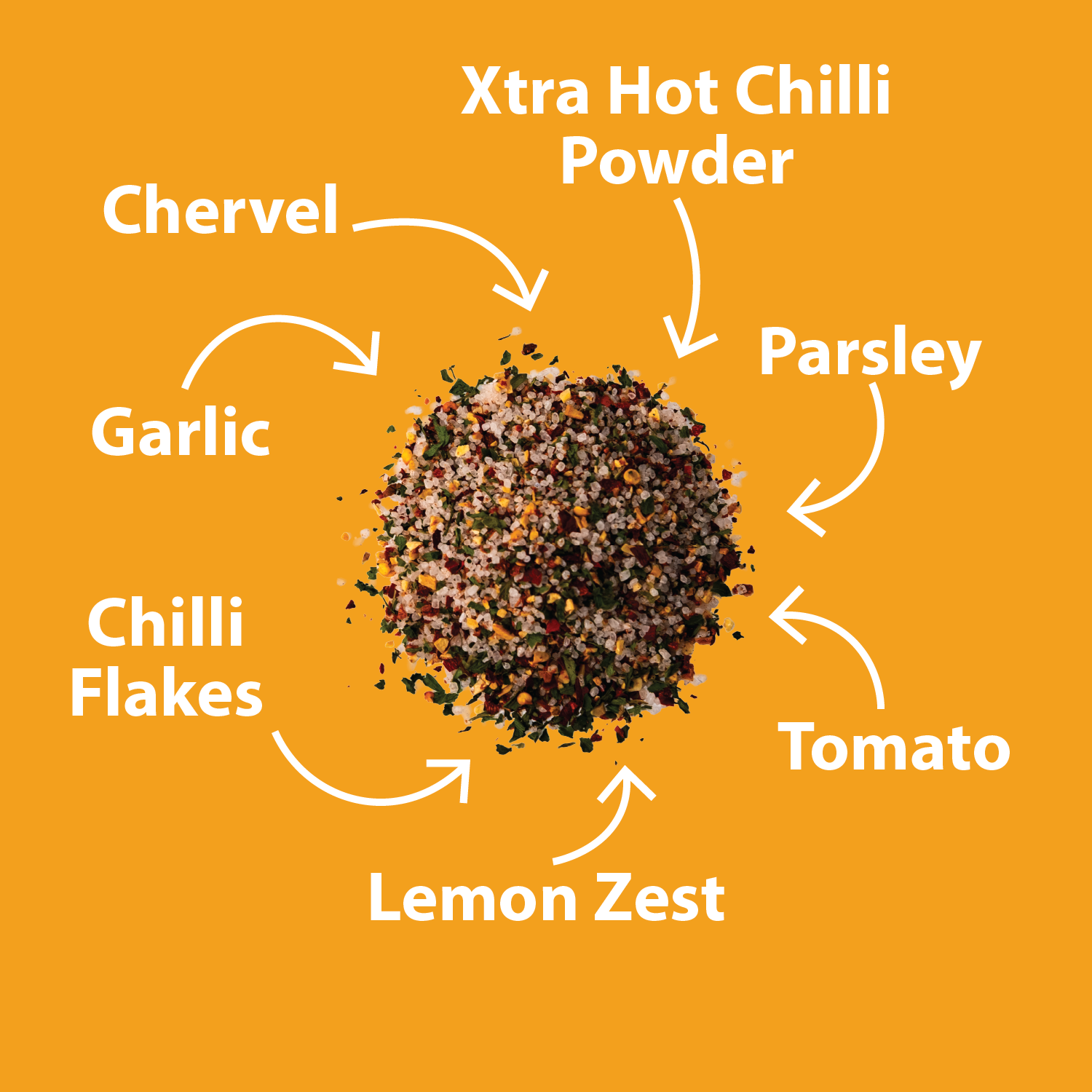 Salt, garlic, chilli flakes, red pepper, paprika, tomato, parsley, lemon zest, chervil, extra hot chilli powder.
